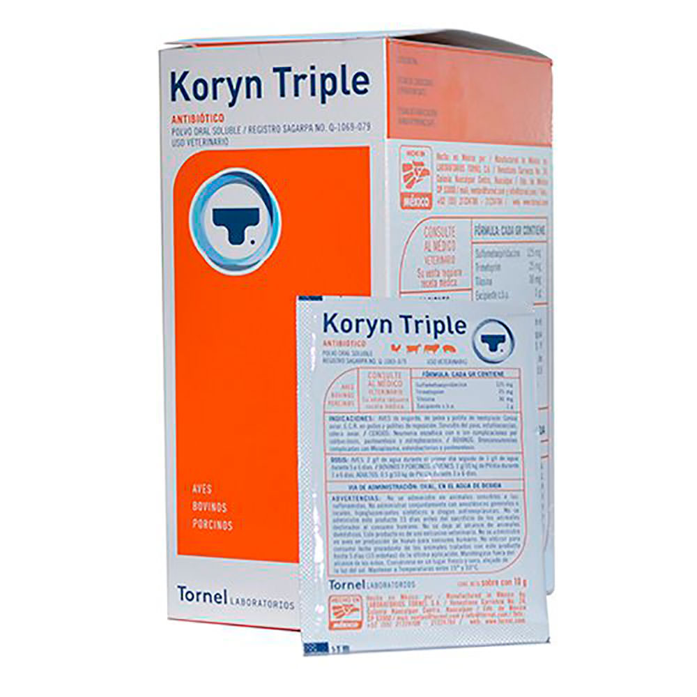 Koryn Triple para el tratamiento de las infecciones de las vías respiratorias como coriza, laringitis, sinusitis, neumonías, bronquitis agudas y crónicas; para el tratamiento de enfermedades genitourinarias (uretritis, cistitis, vaginitis, pielonefritis y metritis); para afecciones del aparato digestivo: disentería, colibacilosis, gastroenteritis y diarreas por diversas causas.
