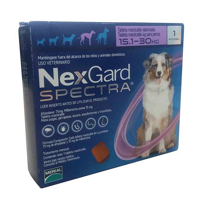 Nexgard Spectra es un desparasitante interno para perros que ademas lo protege de manera muy efectiva de pulgas y garrapatas durante 1 mes.