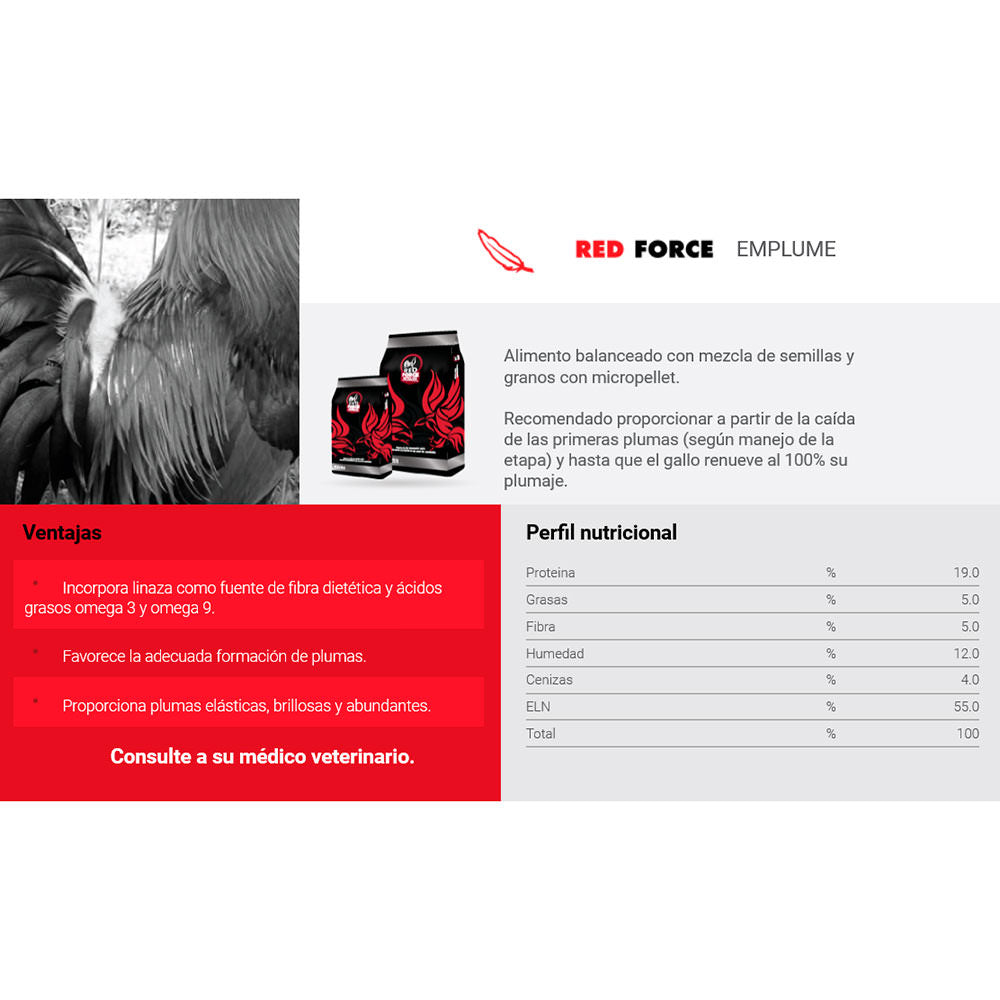 Recomendado proporcionar a partir de la caída de las primeras plumas (según manejo de la etapa) y hasta que el gallo renueve al 100% su plumaje.