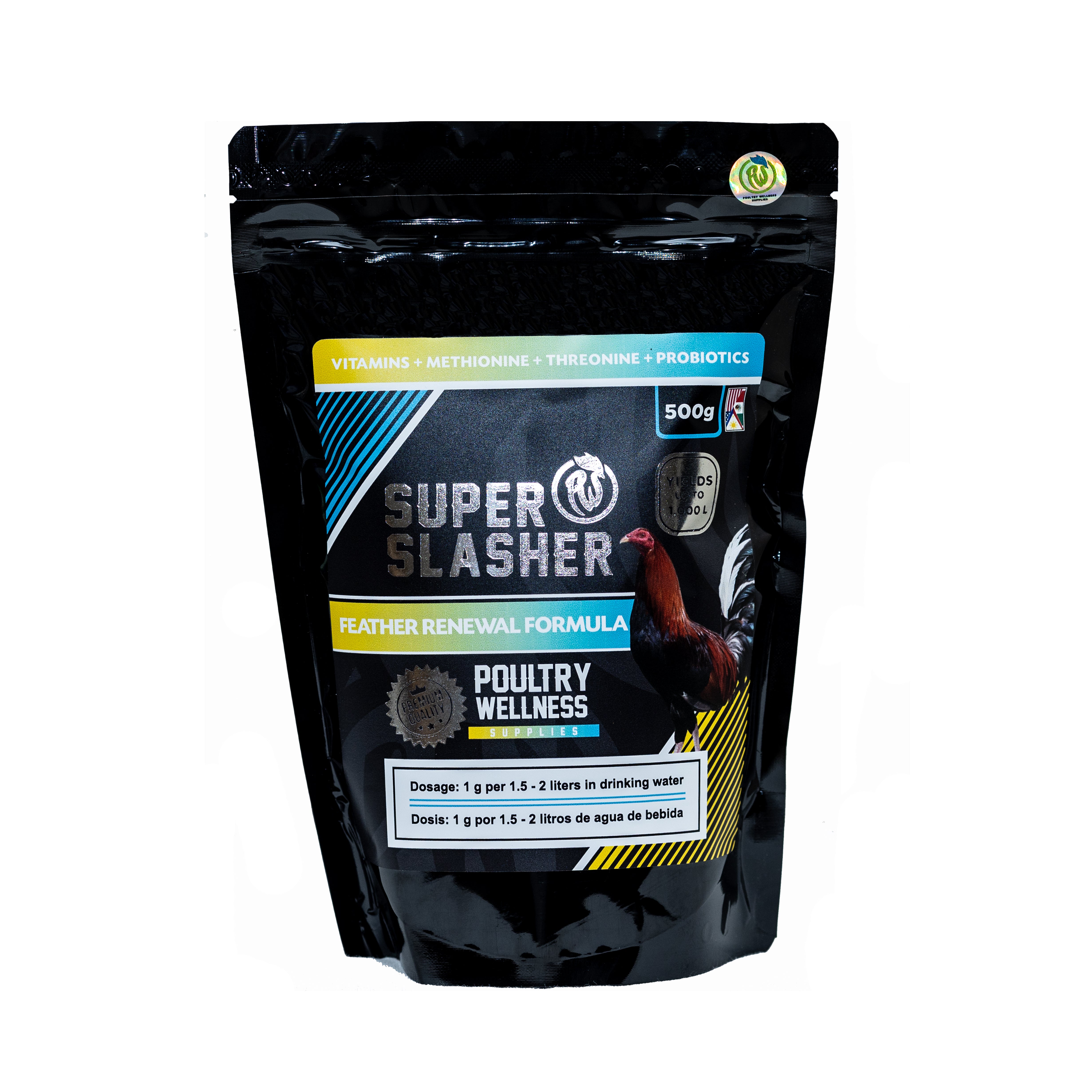 PWS - Poultry Wellness Supplies, presenta un producto indispensable en cualquier gallera, El Super Slasher FEATHER RF -ESPECIAL PARA EMPLUME-, una súper combinación especializada de Vitaminas, Metionina, Treonina y probióticoa, solubles en agua esenciales para la etapa de emplume de gallos, pollada, gallinas, animales convalecientes, etc.