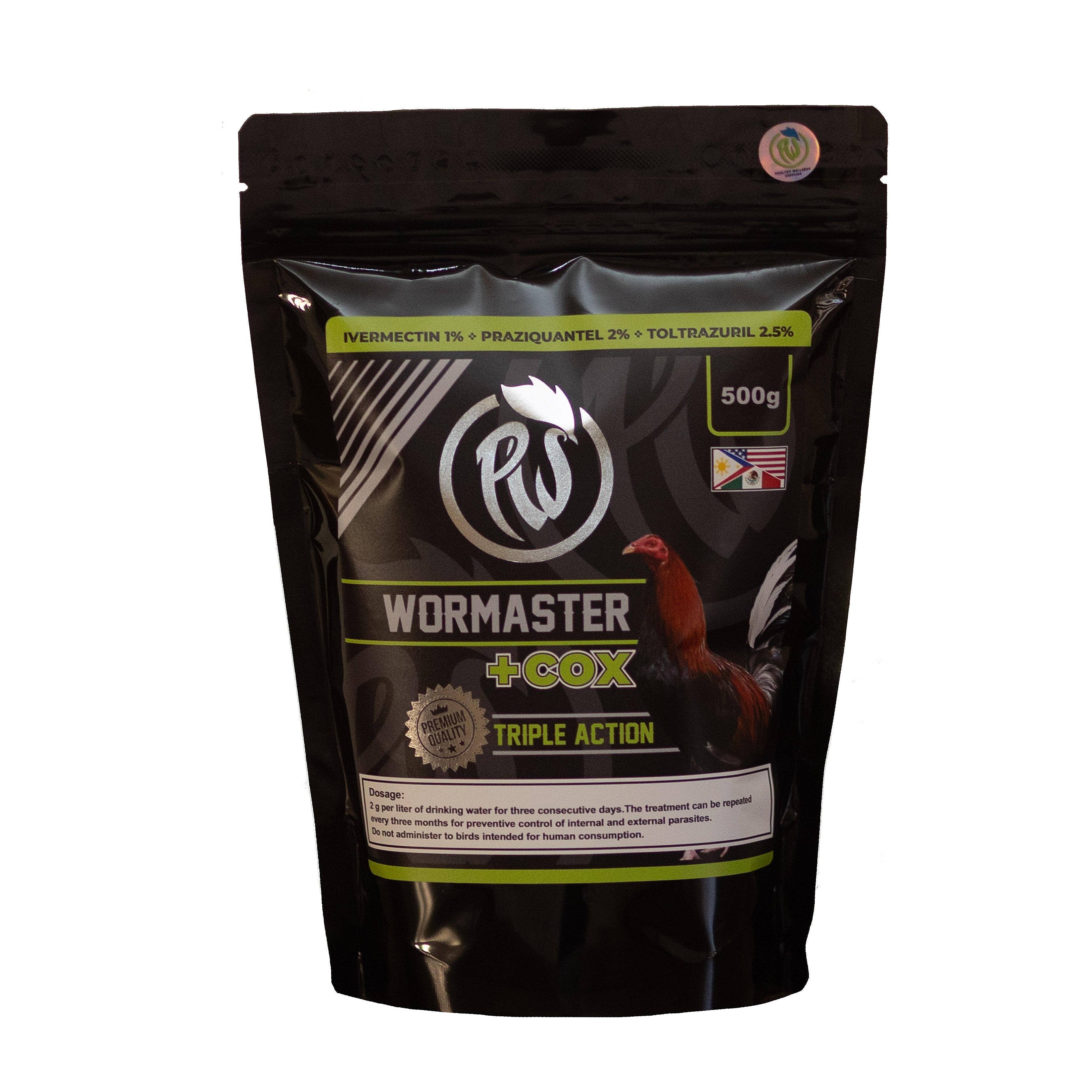 PWS - Poultry Wellness Supplies, trae el nuevo súper desparasitante WORMASTER + COX con una fórmula compuesta por la mezcla y dosis perfecta de Ivermectina, Prazicuantel y TOLTRAZURIL. Obtén 3 Acciones en 1 sola toma - parásitos internos x externos y coccidiosis - coccidia.